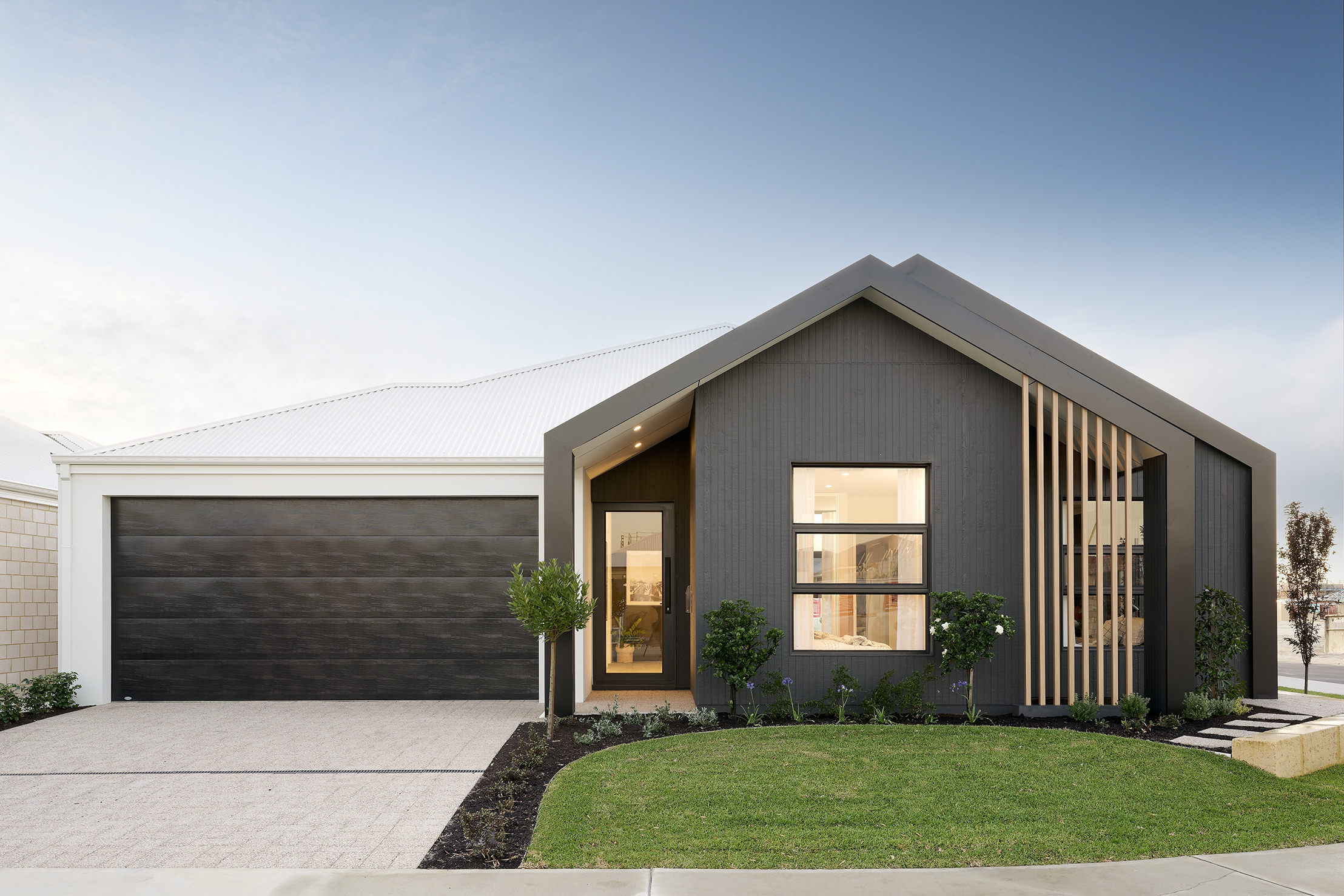 Drawing inspiration from the mesmerising interplay of natural light and the enchanting moon, this captivating residence seamlessly bridges the gap between indoor and outdoor living. Step into the welcoming embrace of Takoma, where a timeless palette of black, white, and slate grey interplays with organic splashes of colour. Muted wood accents and touches of greenery serve as subtle reminders of the beauty that lies beyond these walls, fostering a tranquil ambience.