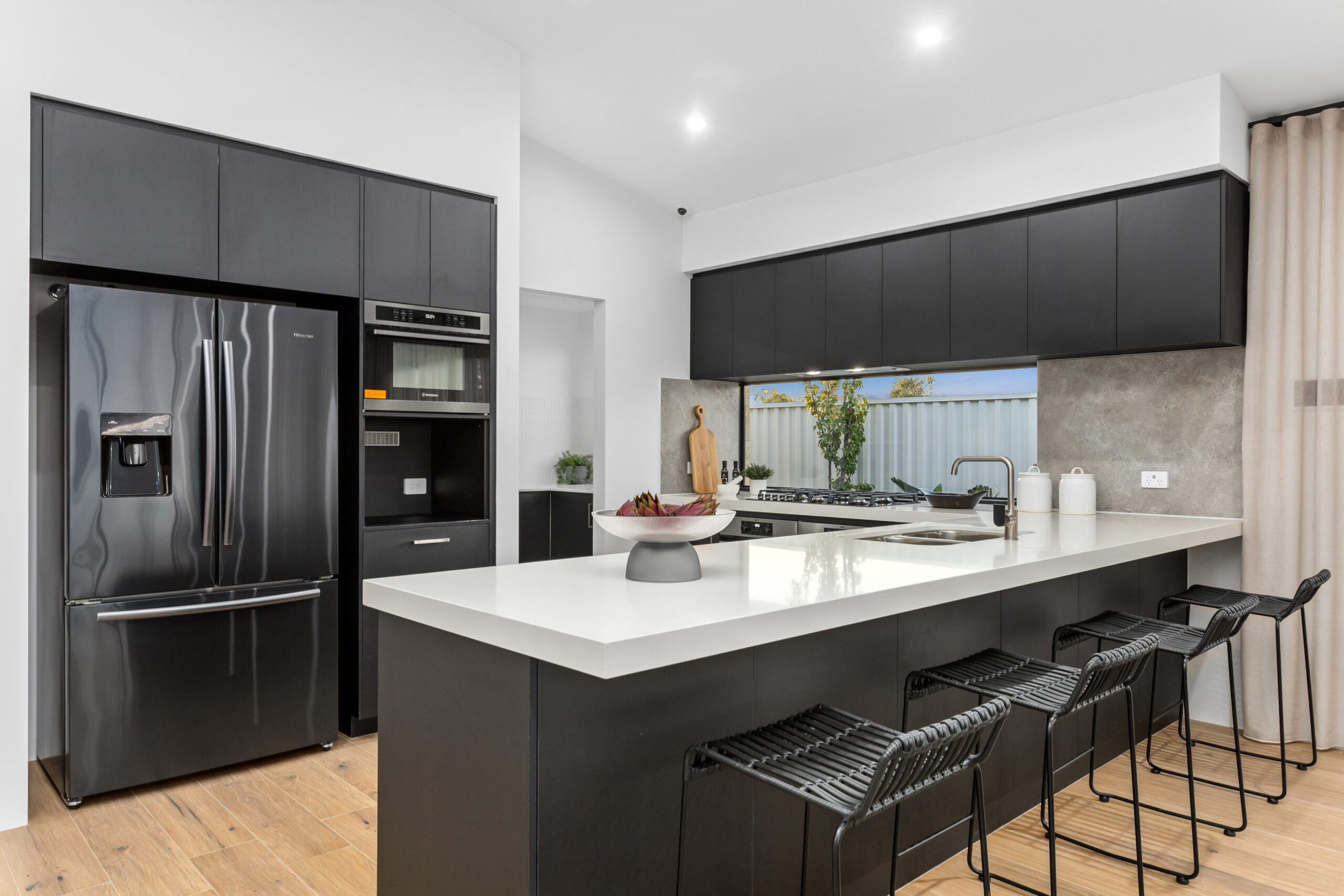 The Evolution offers a perfect family home, boasting an open, spacious layout complemented by high-quality finishes that elevate both comfort and style, with a stunning front elevation that creates a bold statement of modern style. Premium specifications include AEG appliances with double ovens, ZeroSilica stone bench tops throughout, fully ducted reverse cycle air conditioning, and premium Caroma tapware.