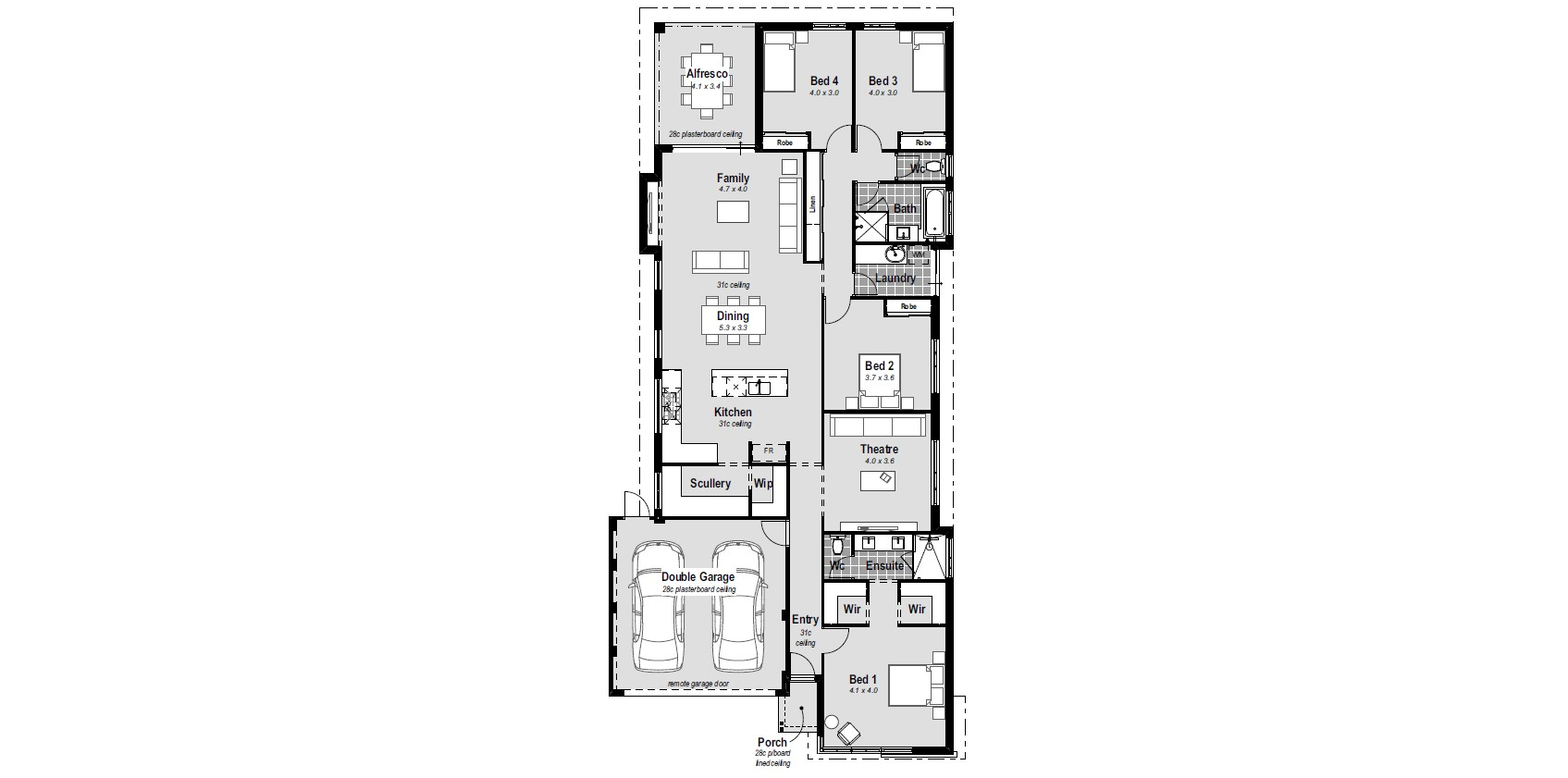 The Evolution is a modern home designed with family entertainment in mind, featuring a chef’s Kitchen and Scullery that flows out to the open-plan dining and living areas, four large bedrooms, two bathrooms and a separate home theatre.