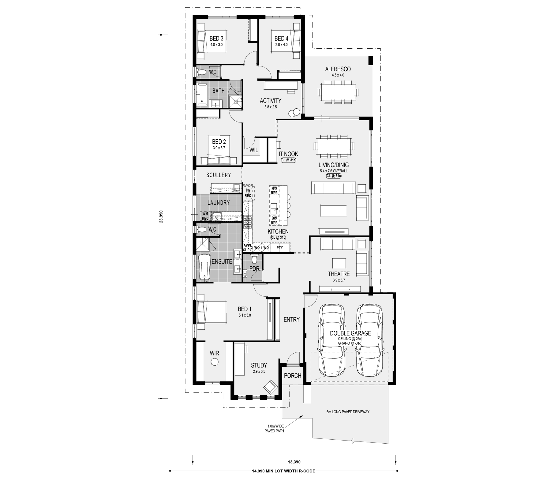 Inspired by the 2023 Telethon Home, this impressive four-bedroom, two-bathroom home places Home Group’s exclusive Luxury Kitchen at its heart, featuring a large island bench, double wall ovens, and ample storage, perfect for every home cook and budding chef. At the front of the home, you’ll find the master bedroom with it’s accompanying ensuite. The home even has a dedicated theatre room for relaxing in style. Toward the back of the home are the secondary bedrooms and an activity room, the layout ensures both privacy and a seamless flow throughout the home.