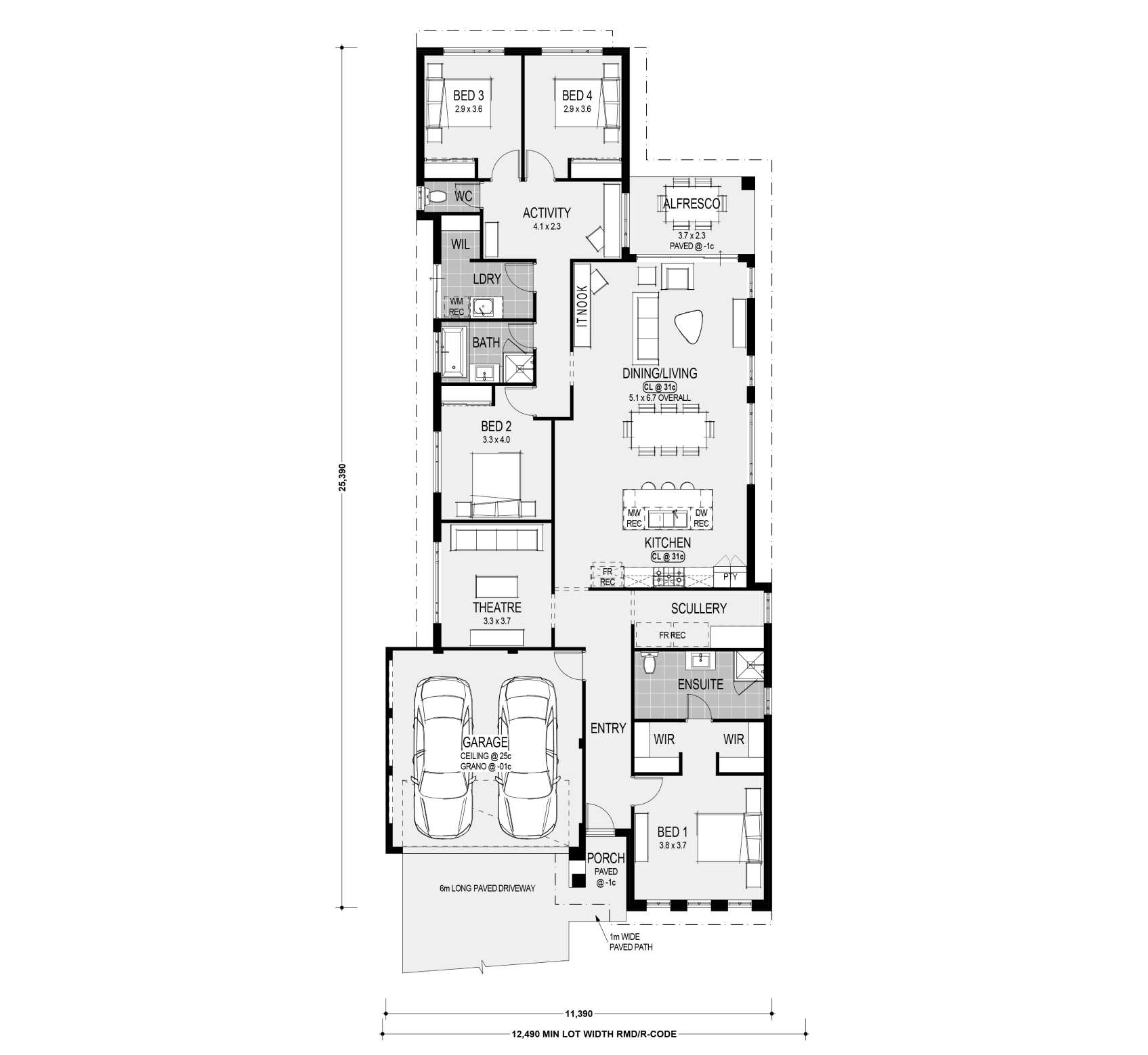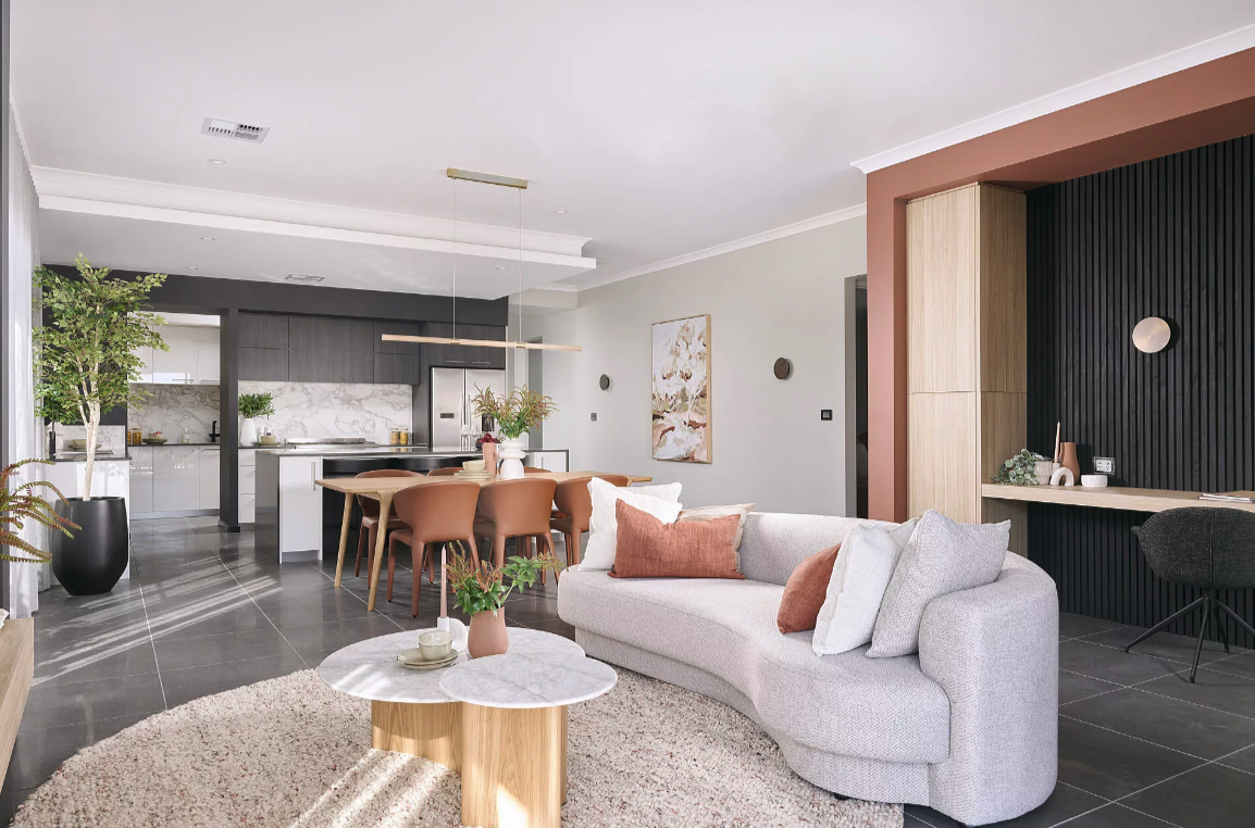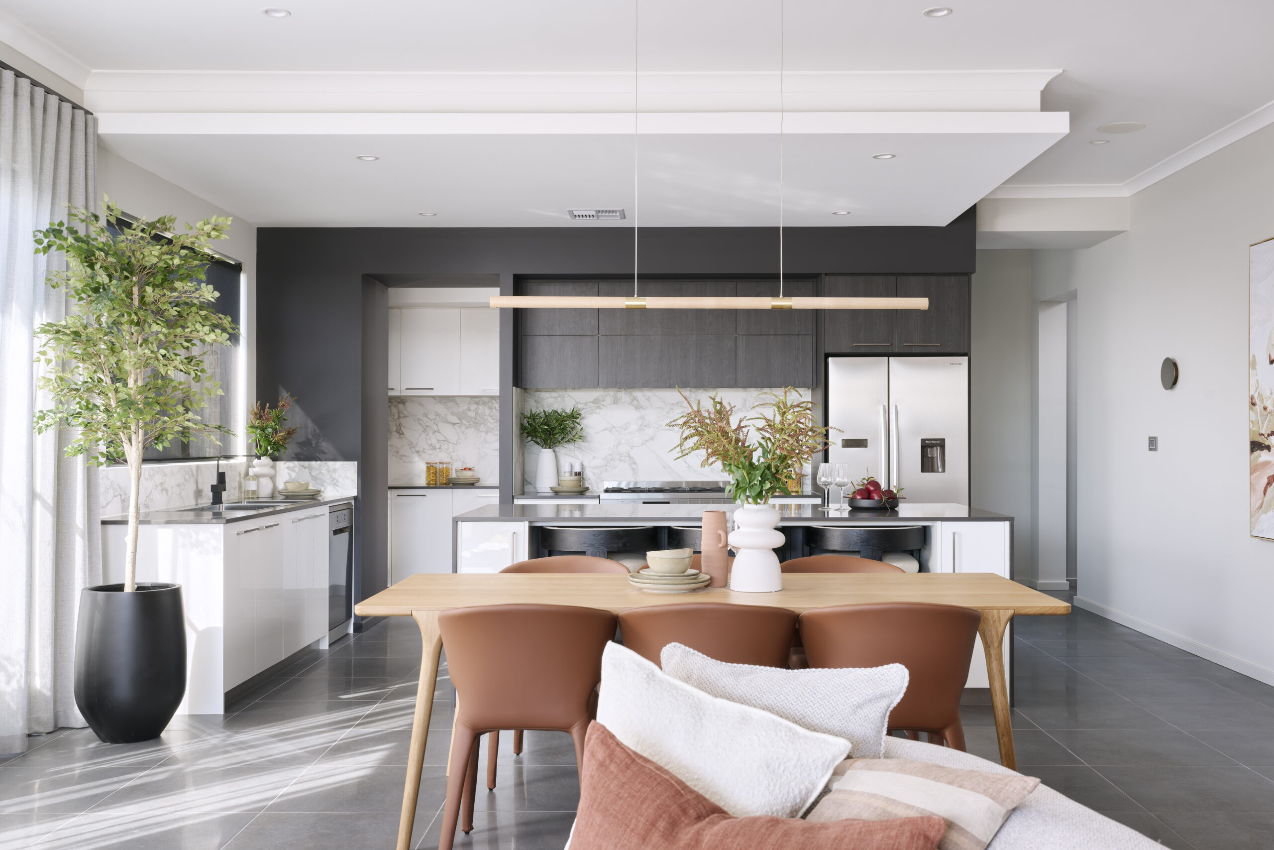 This beautifully designed four-bedroom, two-bathroom home offers a thoughtful layout, with the secondary bedrooms, activity room, and powder room toward the rear. The master bedroom and theatre room are situated at the front, providing a serene retreat for parents. At the center of the home, Home Group’s exclusive Contemporary Kitchen. It’s thoughtful layout will have you dreaming of cooking in this kitchen. It features a 900mm freestanding stove, abundant storage, a convenient kitchen sink positioned to the side and of course the star of the show, the 1200mm wide island bench, perfect for food preparation and entertaining guests. Come and see the difference in a home built by Home Group.