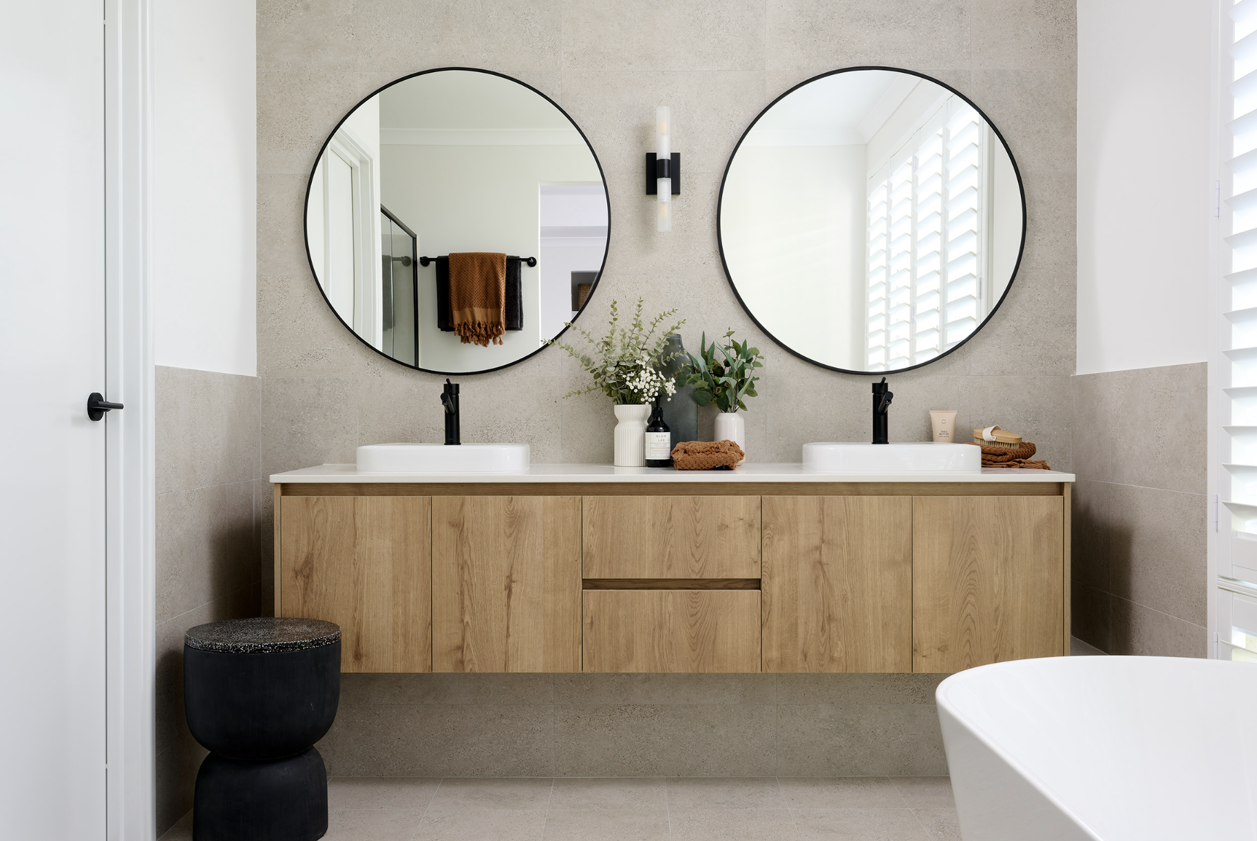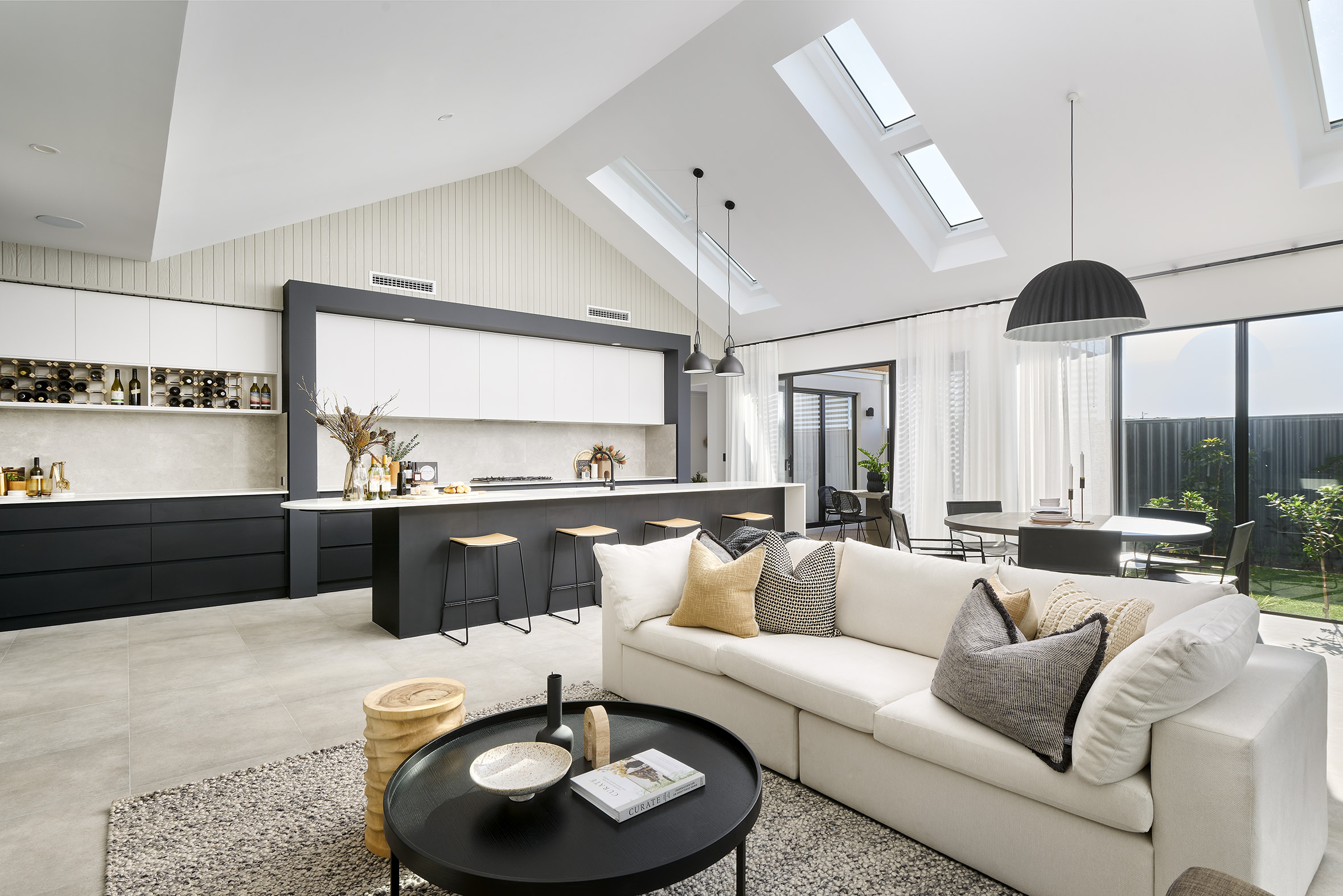 Drawing inspiration from the mesmerising interplay of natural light and the enchanting moon, this captivating residence seamlessly bridges the gap between indoor and outdoor living. Step into the welcoming embrace of Takoma, where a timeless palette of black, white, and slate grey interplays with organic splashes of colour. Muted wood accents and touches of greenery serve as subtle reminders of the beauty that lies beyond these walls, fostering a tranquil ambience.