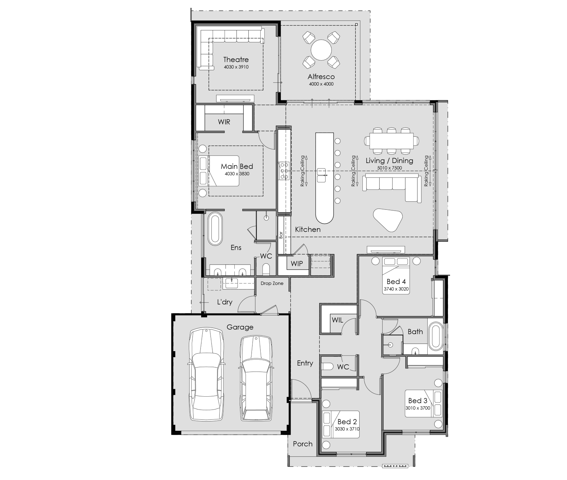 Experience the grandeur of the Takoma as you are greeted by a sweeping porch with a striking raking ceiling. The entrance, boasting an impressive 2800m ceiling height, invites you into a world of luxurious comfort and contemporary style, while the raking ceiling extending into the kitchen, living, and dining areas creates an atmosphere of spacious sophistication. Indulge in the convenience of a thoughtfully designed drop zone, adding a touch of practicality to your everyday routine. Enter into the luxurious master suite, featuring a beautifully recessed ceiling. Enter into the ensuite, where the hotel-style double vanities and stunning freestanding bath await to wash away the worries of your day.