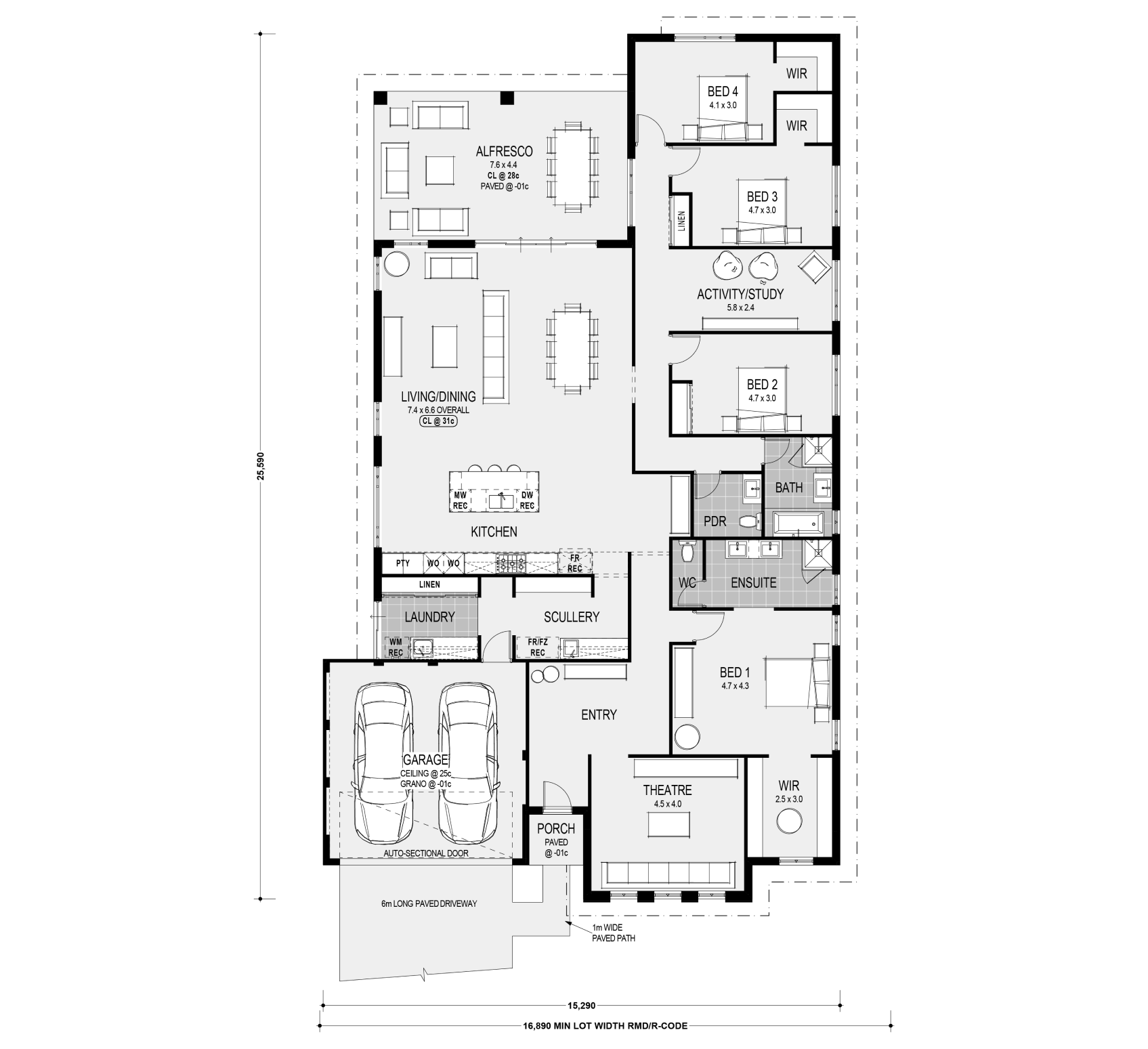 Premiere four-bedroom two bathroom home showcasing a luxurious living area with Master Bedroom and Theatre to the front of the home. The minor bedrooms and Activity are located towards the back creating a separate “kids wing” with powder room. Home Group’s exclusive Luxury Kitchen is equipped with a large island bench, double wall ovens and extensive storage, all located in the centre of the home which makes for a perfect view of the large entertainer’s alfresco.