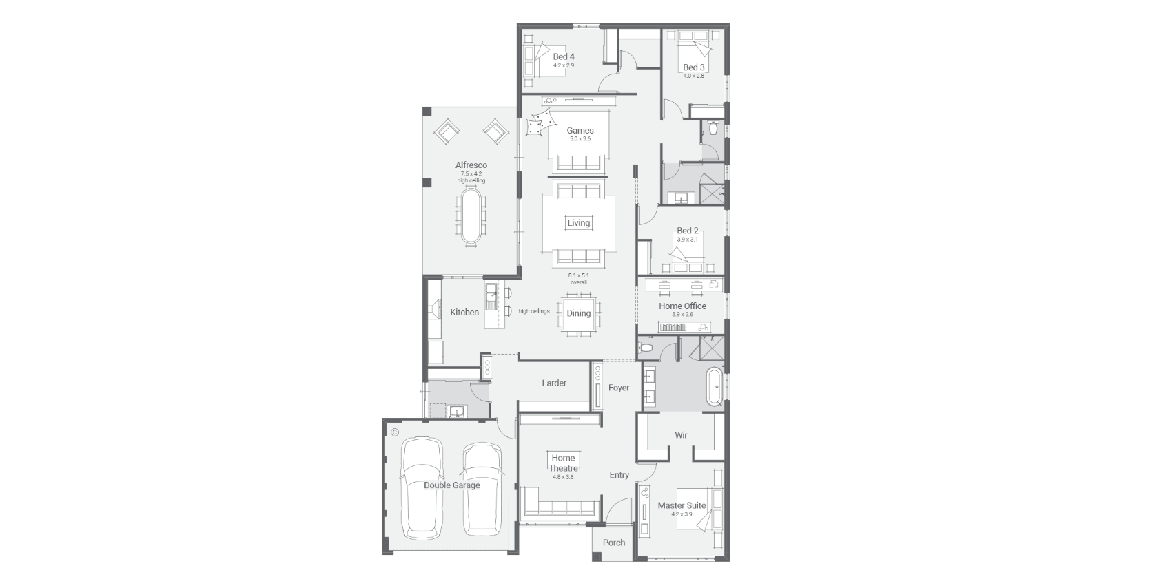 Walk through the generous foyer and embrace the light and warmth of the open-plan living area. Functionality awaits, with a home office on the left and a state-of-the-art kitchen and larder on the right, designed to cater to the needs of an active family. A grand servery window gracefully bridges the kitchen and alfresco area, making this entertaining space seamless. At the rear of the home lies a games room, encircled by three bedrooms and a generously sized bathroom, making it the perfect space for growing kids.